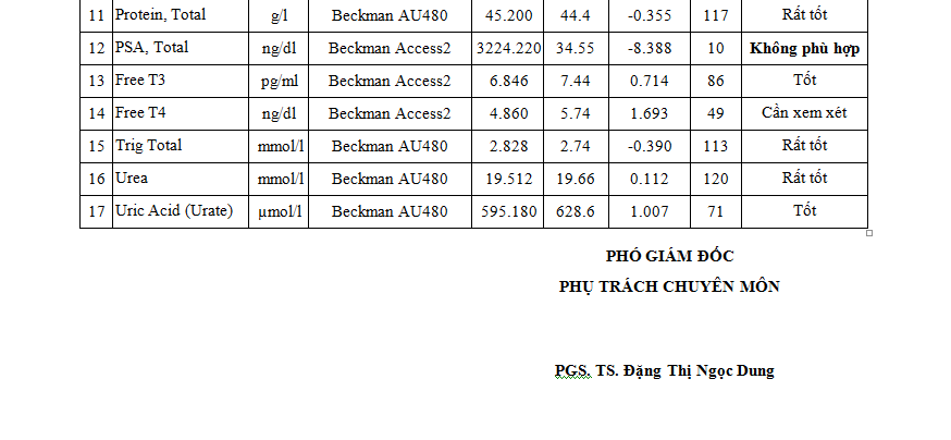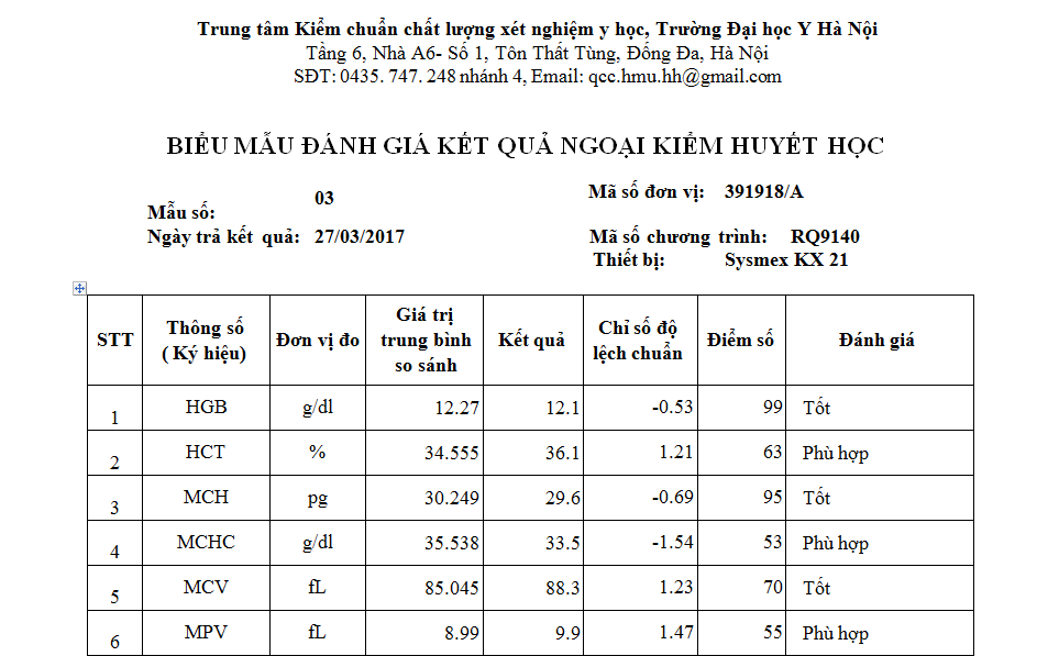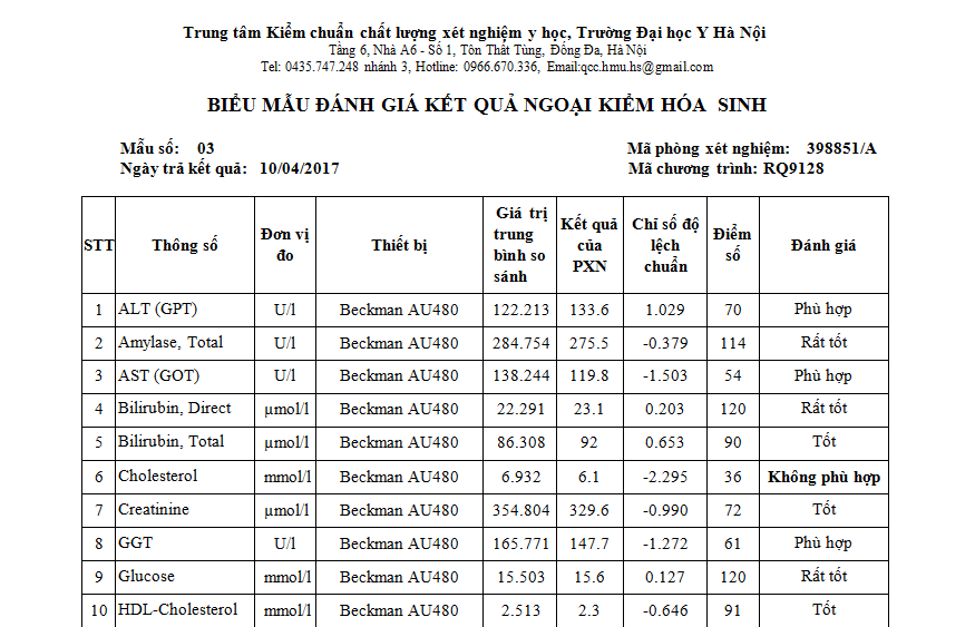Kết quả ngoại kiểm chất lượng xét nghiệm sinh hóa và huyết học