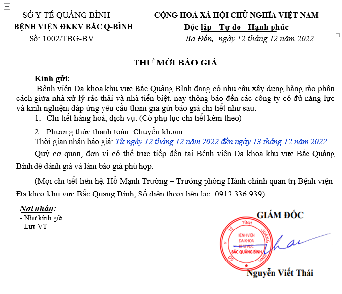 Thư mời báo giá xây dựng hàng rào phân cách giữa nhà xử lý rác thải và nhà tiễn biệt   (12-12-2022)