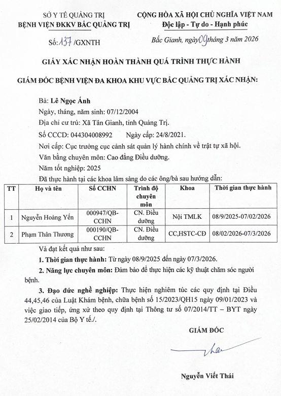Danh sách hoàn thành thực hành tại bệnh viện tháng 03/2026